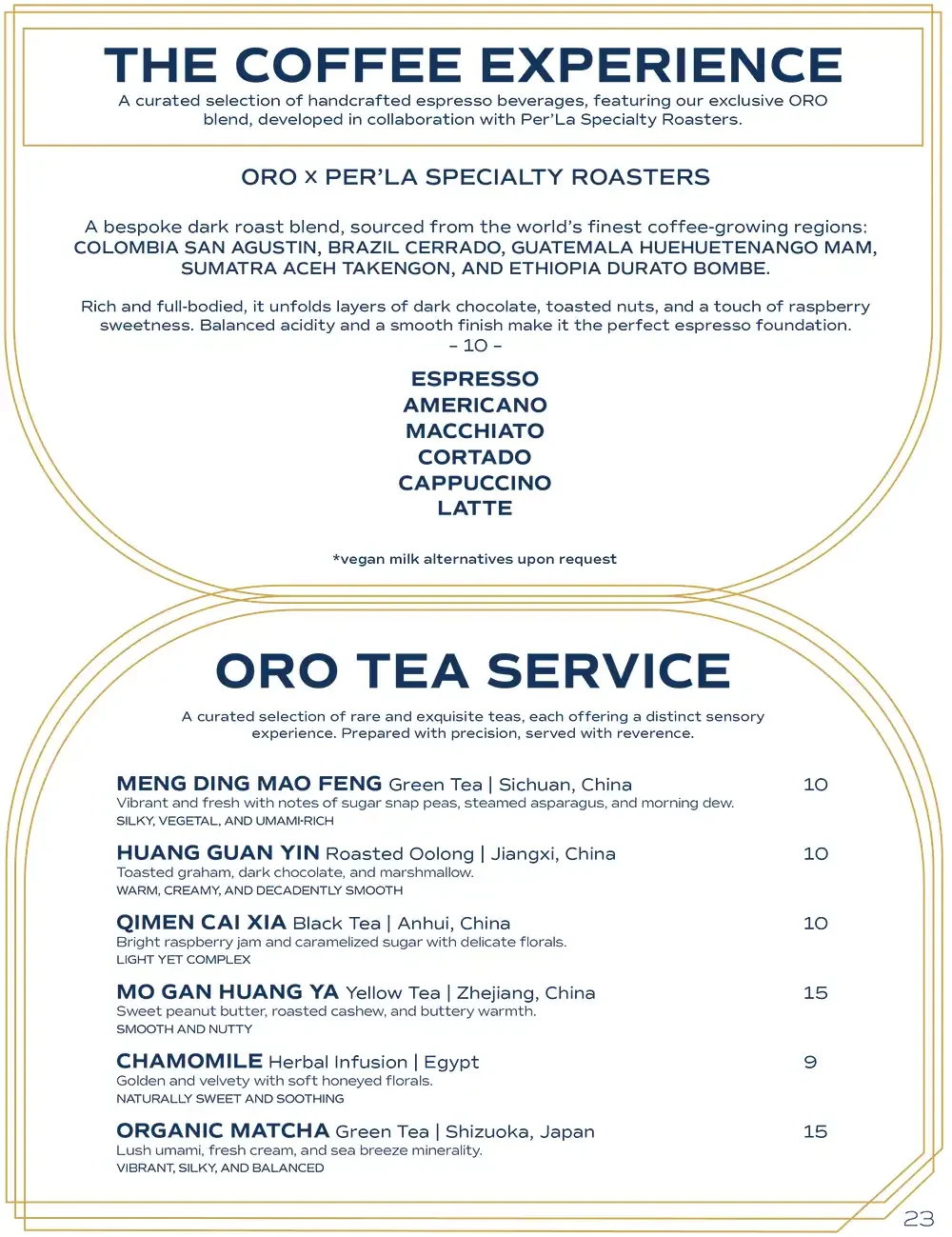 At ORO, our culinary philosophy is built on precision, seasonality, and a global perspective. Rooted in the ecosystems of South Florida and shaped by techniques from around the world, every menu reflects a balance between discipline and discovery. We work closely with farmers, foragers, fishermen, and producers who share our values, allowing us to source with intention and cook with clarity. Across every service from dinner to brunch and beyond, the focus remains the same: bold compositions, clean flavors, and thoughtful progression. Each element is part of a larger rhythm, designed to unfold with purpose and reflect a deeper commitment to craft. This is not just a menu. It is a living system built to evolve, to surprise, and to hold its standard.